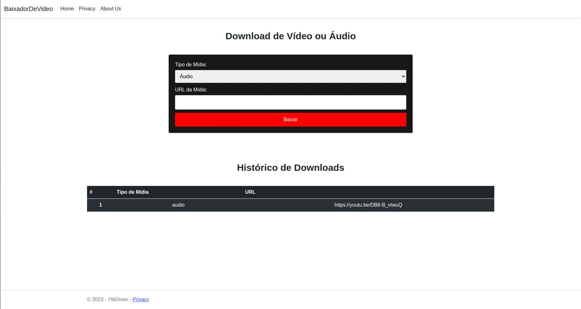 Onde o campo "URL da Mídia" irá ler a URL especificada e irá fazer o download do arquivo de acordo com o tipo de mídia especificada. Em baixo temos o "Histórico de Downloads" onde armazena por 30 minutos no cachê do navegador as URL's que foram copiadas e baixadas. Como na imagem a baixo printada após um download: